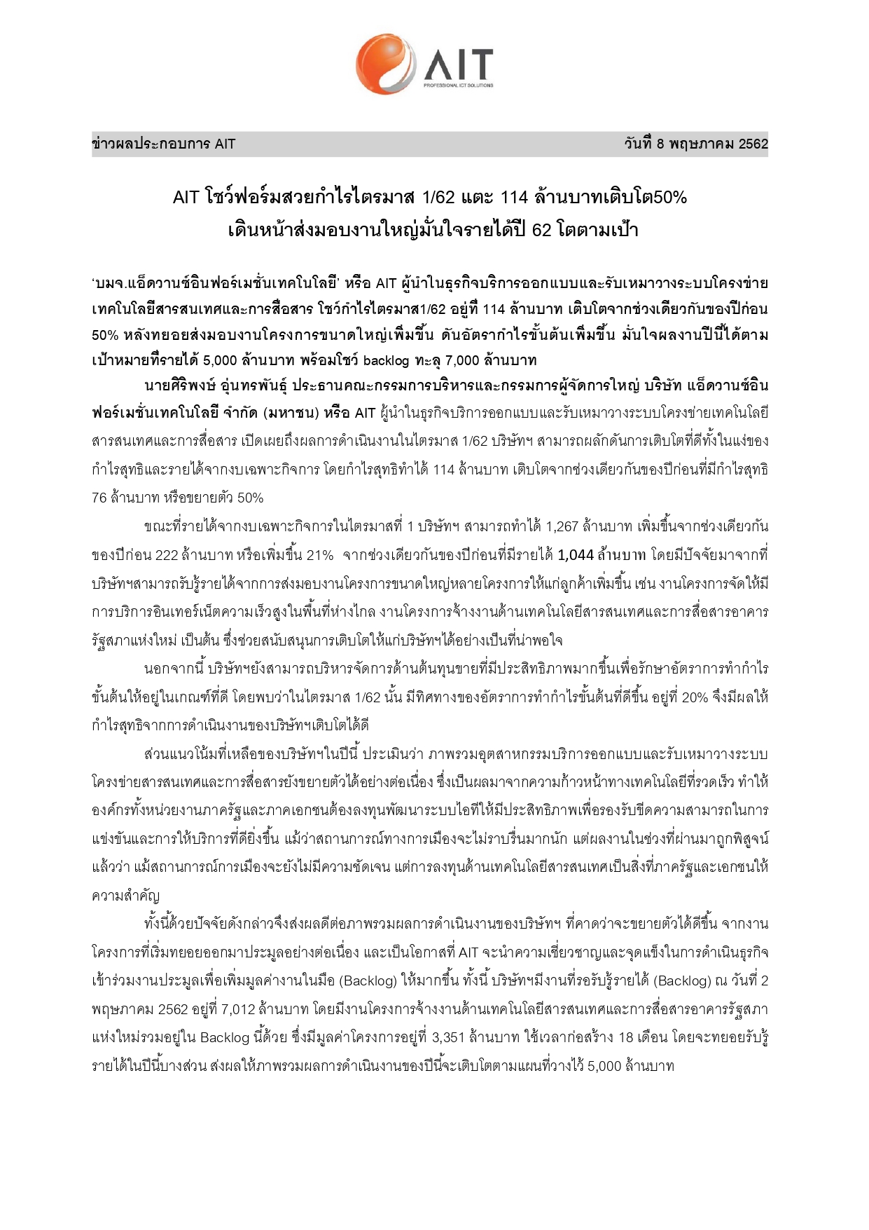 AIT โชว์ฟอร์มสวยกำไรไตรมาส 1/62 แตะ 114 ล้านบาทเติบโต 50% เดินหน้าส่งมอบงานใหญ่มั่นใจรายได้ปี 62 โตตามเป้า